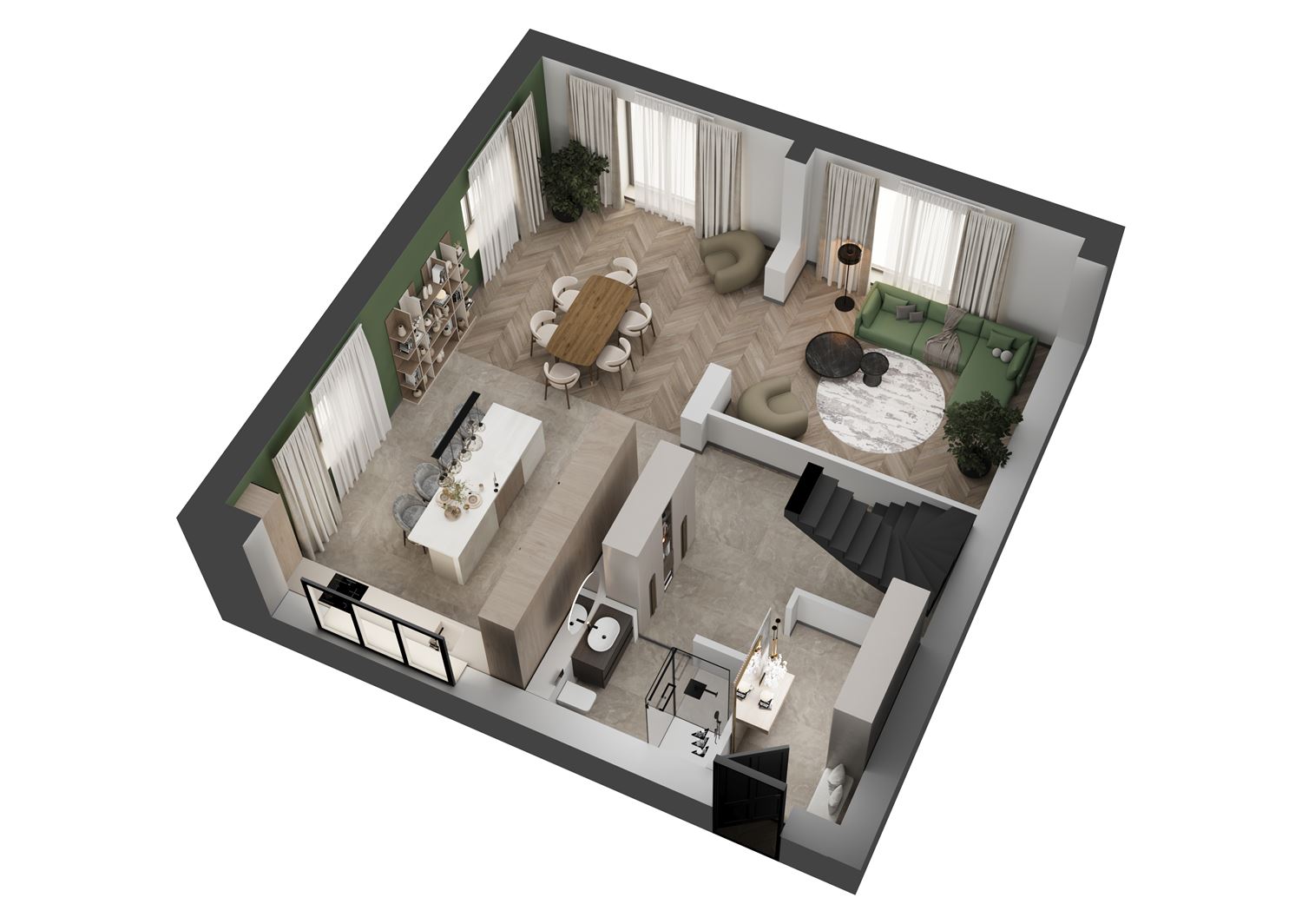 1 этаж: кухня-гостиная 49,4 м2, комната 19,5 м2
